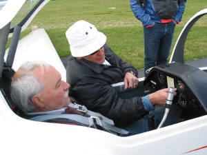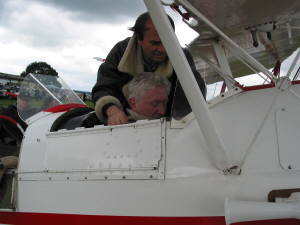 | Auf dem Flugplatz angekommen wurde es für einige der Rallyeteilnehmer Ernst. Karl Heinz Stegemann, Gewinner des 1. Preises nahm im Doppeldecker Platz und wurde zu unser aller Vergnügen vom Piloten mit Loopings und Schrauben mal so richtig durchgeschüttelt. Platz 2, dotiert mit einem Motorsegler Flug trat Joachim Maier an und den wohl rasantesten Start legte Bernd Adams, Beifahrer und Mechaniker von Michael (Obi) Lehmacher mit seinem Windenstart im Segelflugzeug hin. |